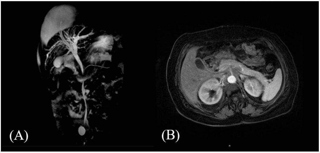 In September 2021 the patient went to the appointment. At the moment, she was asymptomatic with a normal physical exam. A Magnetic Resonance Cholangiopancreatography (MRCP) and blood tests were ordered, and a follow-up consult was scheduled.