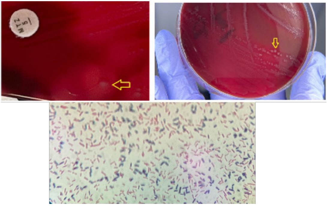 Both sets of aerobic and anaerobic blood cultures (BACTEC Plus Aerobic, BACTEC Lytic Anaerobic, BD BACTEC™ FX40) yielded positive in 24 hours, and the initial Gram stain directly from the bottle revealed Gram-variable rods. The blood culture broth was sub-cultured onto the surface of Columbia (Columbia agar + 5% sheep blood; bioMerieux), chocolate agar (Chocolate agar + PolyViteX™, bioMerieux), and MacConkey agar, which incubated under aerobic and anaerobic conditions. The occurrence of anaerobic growth of Gram-positive boxcar-shaped rods on Gram stain (Figure 1), with negative catalase reaction and the phenotypic characteristic of the presence of double-zone hemolysis indicated the presence of Clostridia species. The microorganism was identified by mass spectroscopy as Clostridium perfrigens with a 99.0% confidence value using the Vitek® MS system (bioMerieux) and also by MALDI TOF (Brucker, MS system) with a score value of 2.31.