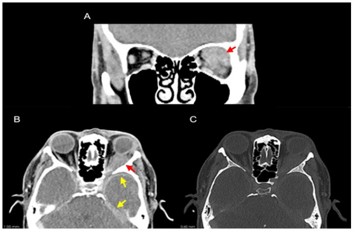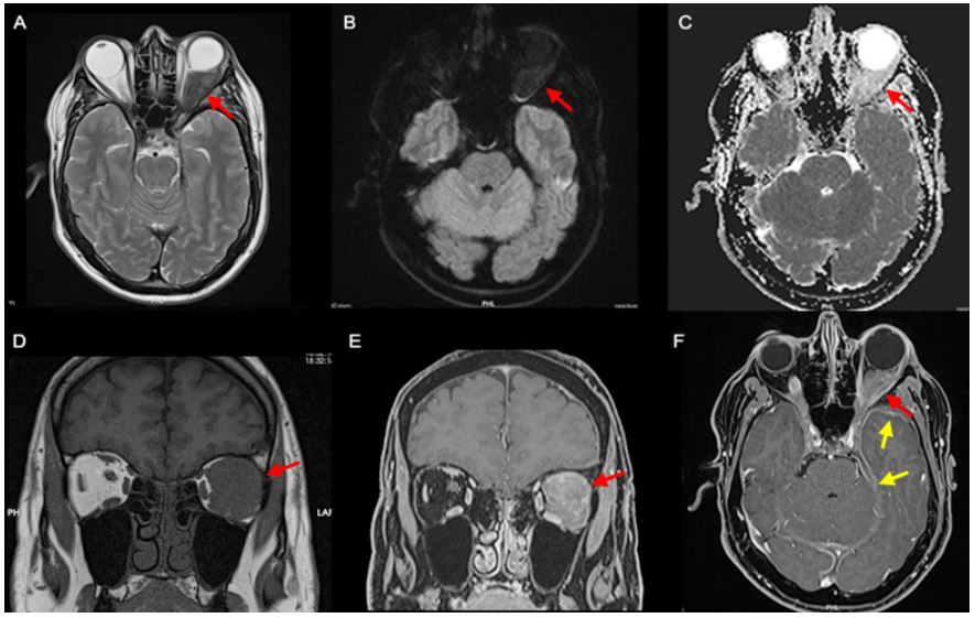 A 58-year-old man with a medical history of hypertension, controlled with candesartan and hydrochlorothiazide, and surgical history of left eye cataract surgery using retrobulbar anesthesia 1 month prior presented with complaints of blurry vision and headaches since the surgery. Ophthalmologic examination revealed left proptosis, chemosis and limitation of upwards and downwards eye gaze, without diplopia. A central scotoma and hyporeactive left pupil were also documented without clear relative afferent pupillary defect. Routine laboratory results were unremarkable. Urinalysis did not show proteinuria or hematuria. Computer Tomography (CT) (Figure 1) and Magnetic Resonance Imaging (MRI) (Figure 2) were performed that revealed a left intraorbital infiltrating soft tissue lesion with involvement of the superior and lateral rectus muscles and extension into the preseptal space, involving and enlarging the lacrimal gland. The lesion displaced the left optic nerve medially and the globe inferiorly. A right infiltrating orbital apex lesion with similar imaging characteristics was also documented. Intracranially, temporal and tentorial pachymeningeal thickening was also noted.