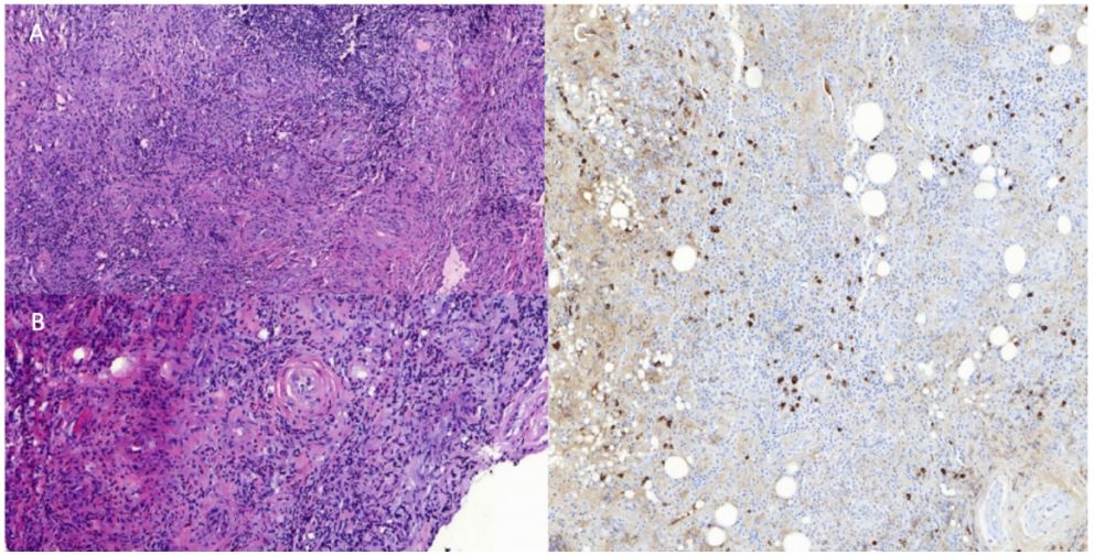 An orbital biopsy was performed which excluded malignant disease. Histopathological analysis revealed elevated counts of 64 IgG4+ cells/HPF and a ratio of IgG4/IgG of 44, 4%. Fibrous changes with a slight whorled pattern was also observed in the tissue specimen (Figure 3). Serum IgG4 analysis was then obtained and found to be elevated at 137 mg/dL.
