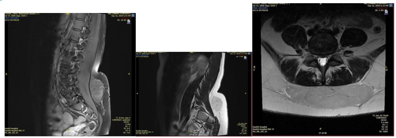 A 19-year-old Emirati female, a known case of disc prolapse, presented complaining of lower back swelling for one year. On examination, the patient looked alert, and oriented with a BMI of 20.4, and was hemodynamically stable. Local examination revealed a soft, non-tender 4x5 cm lower back lump above the natal cleft. Routine blood investigations were within normal range; targeted ultrasound suggested benign morphology soft tissue fibromuscular lipoma. MRI revealed an atypical lipoma in the subcutaneous region of the back at the level of L4-15 vertebra with disc herniation at the same level.