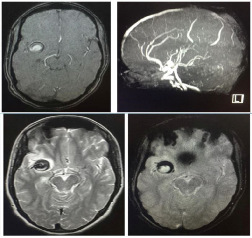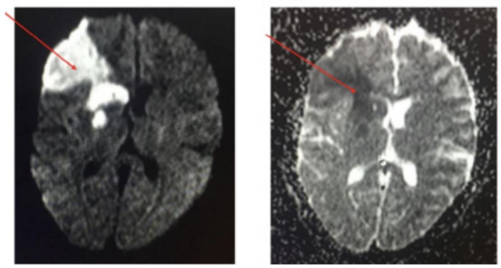 MRI brain done along with MR Angiography-Showed a T2/FLAIR hyperintensity with diffusion restriction in DWI noted right frontal and right gangliocapsular region (Figure 1 marked in red arrow) along with partially thrombosed aneurysm of size 1.8 cm x 1.7 cm arising from M2 segment of Right middle cerebral artery (Figures 2 and 3). Then patient undergone 4 Vessel Doppler of neck and echocardiography, as it showed no evidence of thrombi. Then Serum homocysteine, serum ANA. APLA profile done. USG abdomen screening done for ADPKD. All investigations are within normal limits. So final diagnosis Spontaneous Thrombosis of Unruptured intracranial aneurysm causing acute infarct presenting as isolated Left UMN facial palsy. Neurosurgery opinion obtained as it was spontaneously thrombosed non giant intracranial aneurysm with acute infarction advised to start antiplatelet therapy and watch for any evidence of rupture. After 6-month follow-up, MRI taken aneurysm completely thrombosed and advised to continue antiplatelet therapy.