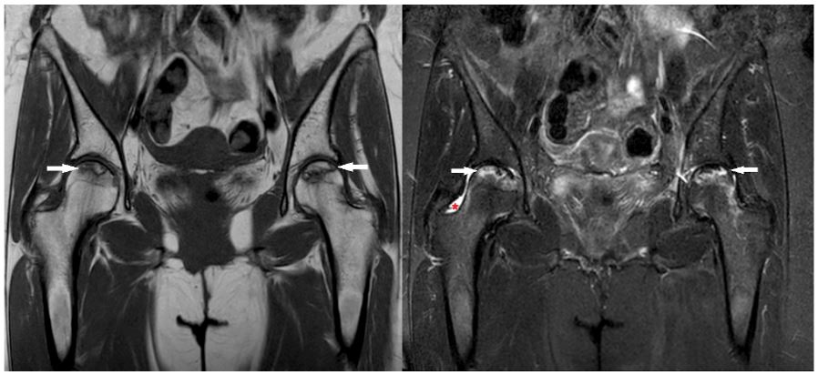 Avascular necrosis (AVN) or osteonecrosis of the femoral head is a condition that occurs as a result of disruption of physiological vascularization in the bone for various reasons and is most commonly seen in the femoral epiphysis [1]. Traumatic and non-traumatic causes play a role in its etiopathogenesis. In traumatic AVN, ischemia occurs when the vascular structure is damaged following fracture or luxation. The most common causes of non-traumatic AVN are steroid therapy and excessive alcohol use [2]. Other risk factors include Gaucher’s disease, systemic lupus erythematosus, organ transplantation, chronic renal failure, hyperlipidemia, and some hematological diseases. Less frequently, it may develop due to diabetes, radiation, and hyperuricemia [3]. In this report, we present an uncommon case of bilateral AVN in the femoral heads after pelvic irradiation in a 47-year-old female patient and discuss AVN treatment with the relevant literature.