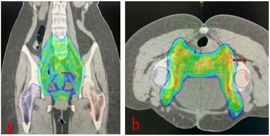 A 47-years-old woman with FIGO stage 3 C1 cervical cancer applied to our clinic in August 2019. She was treated with 50,4 Gy pelvic external beam radiotherapy (EBRT) using the volumetric arc therapy (VMAT) technique with chemotherapy (cisplatin, total 5 cycles of 40 mg/m2 /week). It was followed by 30 Gy intracavitary radiotherapy prescribed to HR-CTV (6 Gy per fraction; once a week). A complete response was achieved three months after. During regular follow-up, 12 months after treatment, the patient complained of pain in her hip and groin. The pain was intensified with movement. In her anamnesis, there was no previous history of trauma or fall. She was a non-smoker, non-diabetic, and non-obese (Body Mass Index: 23.8). She didn’t have any comorbidities. On physical examination, there was a bilateral limitation of motion in hip joints, but there was no visible swelling or redness. Also, the FABER test was positive. The magnetic resonance imaging (MRI) showed a crescent sign and a fissure with bone marrow edema on the bilateral femoral heads (Figure 1). In EBRT treatment plan, only 5% of the bilateral femoral head volume received a dose above 42 Gy. However, the maximum point doses of the right and left femoral heads were found to be 51.3 and 49.4 Gy, respectively. Coronal and axial plan dose distributions of the femur heads are shown in (Figure 2). Considering the patient’s radiotherapy history, imaging findings, and physical examination findings, the patient was diagnosed with bilateral AVN of the femoral head. She was referred to an orthopedic clinic and was advised to undergo bilateral hip arthroplasty. She refused the operation and received conservative NSID and physical therapy. The patient was completely relieved with rest and this regimen. Follow-up MRI at 3- months showed regression of the bone marrow edema on bilateral femoral heads, but the persistence of fissure lines was consistent with AVN. After 1- year, the patient was pain-free and had no difficulty in walking.
