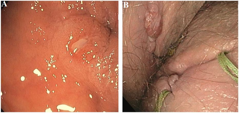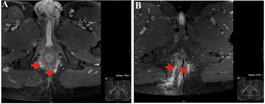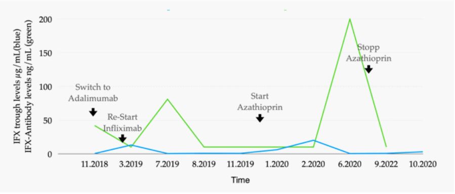 In 2017, a gentleman in his fifties presents to our unit for the management of fistulizing CD. Past medical history is remarkable for a partial small intestinal resection in his twenties, with the macroscopic and histological diagnosis of CD. Due to a mild course of CD, the patient has remained without medical therapy for many years. Unfortunately, there are no preliminary reports from this time, including endoscopies. In 2017, the patient becomes increasingly symptomatic with complex perianal, perirectal, and transsphincteric fistulas. From April to August 2017, the fistulas are drained surgically several times, and Setons are inserted. A colonoscopy in September 2017 showed several fibrin-covered ulcerations and an impassable inflammatory stenosis in the area of the ileocolostomy. In November 2017, immunosuppressive therapy with infliximab (Remicade®) at 400 mg (4 mg/kg body weight) is started with the second dose after 2 weeks, the third after 4 weeks, and then every 2 months [1]. Following our guidance, the patient stopped his long-standing smoking habit in 2019 [9]. After 1 year of infliximab treatment, anti-drug antibodies are detected (Figure 1A), and the therapy is switched to adalimumab (Humira®) [10]. However, due to more pain and secretion from the fistulae, the therapy is switched back to infliximab (Inflectra®) starting with 500 mg (5 mg/kg body weight) at weeks 0, 2, and then every 6 weeks. Low trough levels (0.6 µg/ ml) prompt an increase in dosage at a shorter interval (800 mg, 8 mg/kg body weight every 4 weeks). Because the patient remains symptomatic with purulent secretions from the fistulas, 100 mg/d azathioprine (Imurek®) is added to the therapeutic regimen in December 2019 [11]. Three months later, in March 2020, sigmoidoscopy shows no macroscopic signs of inflammation in the sigmoideum, a mild edematous proctitis and slightly reddened pseudo-polypoid elevations at the anocutaneous line, without recognizable fistula openings. Infliximab trough levels are now in the supratherapeutic range (20 µg/ml) with no detectable anti-drug antibodies. Fistula activity made surgical drainage and Seton insertion necessary in March and May 2020 (Figures 2A + B with pelvic MRI 04/2020). In September 2020, the patient develops Escherichia coli bacteremia and herpes zoster reactivation (shingles) and azathioprine is stopped. In the following 14 months, the patient remains in clinical remission, with continuing subtherapeutic infliximab levels (Figure 1A+B). In December 2021, the patient develops left-sided renal colic and a CT scan reveals urolithiasis and urinary outflow obstruction, and a double J stent catheter is inserted. In January 2022, cystoscopy with flushing cytology leads to the diagnosis of urothelial carcinoma, which is surgically removed by Transurethral Resection of the Urinary Bladder (TURB). Immunosuppression with infliximab is stopped before the operation. In February 2022, a follow-up resection is performed for stage T1 disease. Adjuvant therapy with Bacillus Calmette-Guérin (BCG) installations is started in March 2022 with plans to continue the therapy for 1-3 years. To avoid interferences with the adjuvant BCG immunotherapy, infliximab is not restarted and we decided against the use of other immunosuppressive therapeutic options. A colonoscopy in March 2022 shows a macroscopic (neo) terminal ileitis with evidence of multiple elongated fibrinous ulcerations in the distal 10 cm of the neoterminal ileum and substenosis in the area of the inflamed ileo-colostomy. Perianal Fistula orifices are visible in distal rectum and proximal anal canal inactive at time of examination (Figures 3A+B). Clinical the patient was still in remission. In April 2022, we start CDED with PEN using a nutritional formula (Modulen®) [12-14]. The patient has been able to integrate the diet well into his daily routine. In October 2023, at the time of writing, 18 months after the start of CDED and PEN, he reports normal stool consistency and frequency with two daily bowel movements. The fistulas continue to secrete blood and pus, but without pain or the need for antibiotics. Surgery and antibiotic treatment for fistulas had last been necessary in June 2022, respectively. CD remission under CDED with PEN was confirmed by a low CRP value (6-11 mg/L, normal range <5 mg/ L, see Figure 1A). Similarly, the Crohn’s Disease Activity Index (CDAI) is at 20 points (Figure 1A), indicating persistent clinical remission. A control endoscopy has not yet taken place.