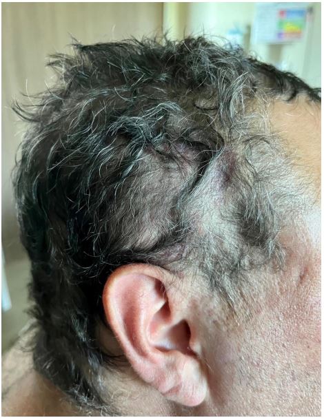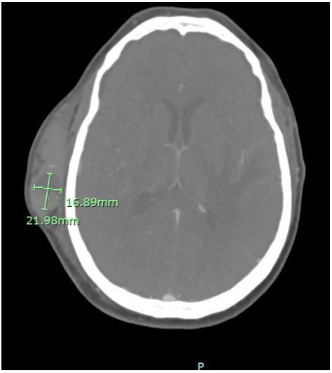 The patient first arrived to the ED from work stating he was sitting at his computer and felt a little shaky when he stood up and noticed a large area of swelling to the right side of his head. He then started to notice a headache but denied dizziness or blurred vision. He had swelling to the right temporal lobe, approximately 9 cm x 6.5 cm in diameter with fluctuance. His extraocular movements and cerebellar function were normal. Initially, his systolic blood pressure was between 146-174, and he was given IV labetalol and IV morphine IV for pain. Of note, his history included previous Cyber Knife surgery for a leftsided arteriovenous malformation one year prior that two neurosurgeons documented were unrelated to the current hemorrhage. The patient’s frontotemporal region continued to enlarge with increasing headache and lightheadedness. The patient denied any trauma to the area. He denied vision changes, difficulty breathing, chest pain, or any focal neurologic deficits. Neurosurgery’s diagnosis concluded as spontaneous hematoma formation of unknown etiology.