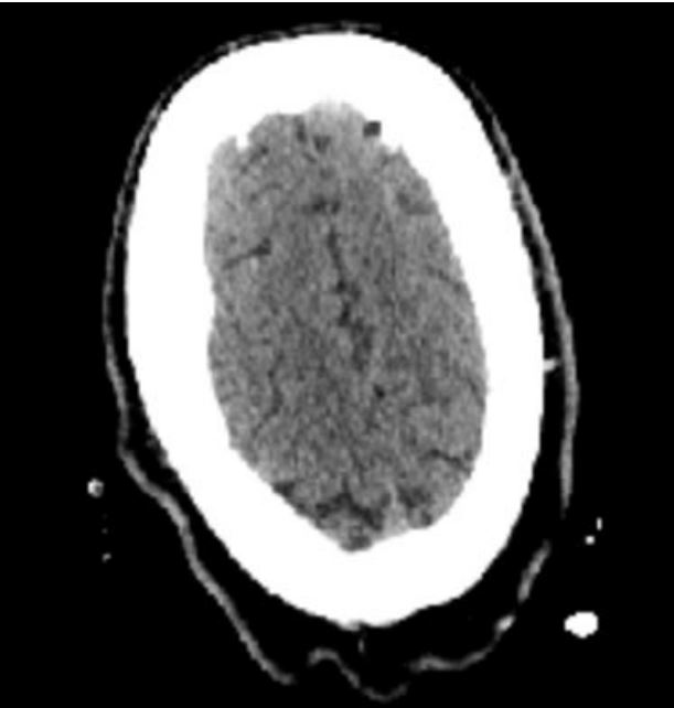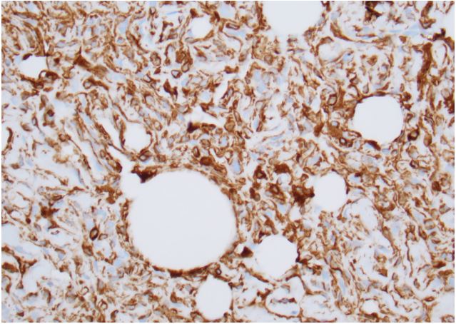 We present a case of a 32-year-old male who presented to the hospital after a motor vehicle accident resulting in multiple facial bone fractures, displaced right third and fourth lateral rib fractures, right lung contusion, right apical pneumothorax, and hemothorax (Figure 1). The patient underwent multiple surgeries, which included right 4th rib open reduction and internal fixation (ORIF), VATS with right upper lobe wedge resection, mechanical pleurodesis, and chest tube placement. Surgical pathology of the VATS specimen revealed a 2 mm irregular nodule with morphologic and immunohistochemical features favoring a meningothelial nodule (Figures 2 and 3). The immunohistochemical stain was positive for vimentin (Figure 4) and epithelial membrane antigen (EMA) and negative for CD56, progesterone receptor, and cytokeratin. A diagnosis of benign pulmonary meningioma was made. The lesion appeared to be excised entirely on the biopsy specimen. Interestingly, this lung nodule was not visualized on any prior chest X-ray or computed tomography (CT) of the chest and was first noted only on the pathology specimen. CT of the head (Figure 5) and the entire spine did not show any primary brain or spinal meningioma, enabling the diagnosis of primary pulmonary meningioma.