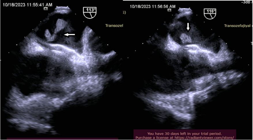The diffusion MRI was taken after the patient re-applied to the emergency department of our center on 18/10/2023 with the complaint of speech impairment and numbness in the left arm. Acute infarction areas with sharply limited diffusion restriction with a long axis of approximately 5.5 cm in size were observed in the cortico-subcortical area at the ventricular level in the right cerebral hemisphere, in the temporoparital lobe, in the right cerebral hemisphere. Medical treatment was arranged according to the recommendation of neurology. In the TEE performed on the patient, an appearance consistent with a pedunculated mobile thrombus measuring 30*14 mm was observed on the left atrial side of the occluder device. After the patient was evaluated by the cardiology-cardiovascular surgery council, a surgical decision was made. The patient was discharged in full recovery after surgical treatment by cardiovascular surgery.