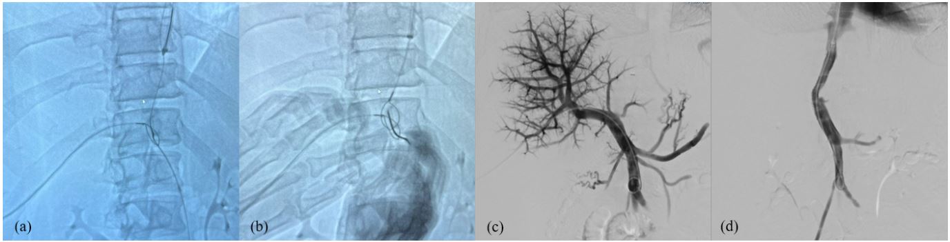 In recent years, TIPS placement has been increasingly recognized as a safe and effective treatment of portal hypertension-related complications, especially in the setting of decompensated cirrhosis, such as refractory ascites (i.e resistant or intractable) and severe or recurrent variceal gastro-intestinal bleeding (rescue and early/pre-emptive TIPS) [1]; moreover, despite a lower amount of literature evidences, TIPS can be considered as a treatment option for hepatic hydrothorax, hepato-renal syndrome, severe hyponatremia, gastro-intestinal bleeding other than those related to gastro-oesophageal varices and both acute and chronic portal vein thrombosis [2]. Similarly to decompensated cirrhosis, the rationale for TIPS in Budd-Chiari syndrome is to rapidly improve portal hypertension, significantly decreasing liver-related complications (ascites, bleeding and hepatic encephalopathy, need for liver transplant) and improving short-and long term survival [3]. Compared to the he high feasibility of TIPS procedure in cirrhosis, the abnormal venous anatomy of patients with Budd-Chiari syndrome has raised some technical concerns, especially in those with completely thrombosed supra-hepatic veins and IVC involvement. In these cases, a transcaval approach has been shown, almost 20 years ago, to be the first choice to achieve a clinically significant decrease of hepatic congestion and, consequently, portal hypertension and liver-related morbidity and mortality [4]. In previous years, many different procedures were described, such as a direct fluoroscopy-guided puncture of both portal vein and IVC with a single needle-catheter or using a intravascular or trans-abdominal US-guided catheter for reaching the portal bifurcation from the IVC and a trans-hepatic access to allocate the stent [5]. In our case, a successfully treated patient with decompensated Budd-Chiari syndrome with a Trans-Jugular Trans-Caval Intra-Hepatic Shunt (TTIPS) is shown. Because of the impossibility to punch the fibrotic wall of the inferior vena cava (old thrombosis), two guidewires were placed in portal vein and IVC lumens by a trans-jugular and percutaneous access, respectively. Then, they were aligned and captured by a third metallic guide through an epigastric trans-cutaneous puncture obtaining a direct route from IVC to the portal vein which allows the release of a covered PTFE stent through the classical trans-jugular access.