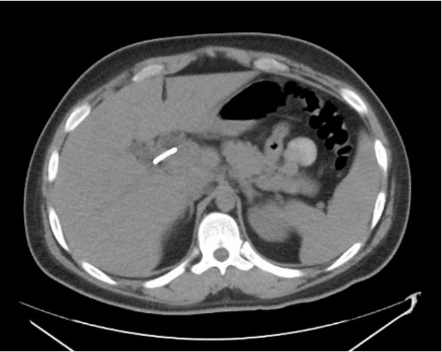 A 21 yo presented to the clinic with a medical history of choledocholithiasis status post biliary stenting. About eight months prior was presented with a 3-week history of dark colored urine, decreased appetite, periodic fevers, generalized weakness and lethargy as well as sharp pain in his abdomen and was diagnosed with choledocholithiasis. At that time, he underwent an Endoscopic Retrograde Cholangiopancreatography (ERCP) with biliary stent placement. Imaging and lab work were completed prior to any intervention. A CT scan of the abdomen revealed a stent in a dilated hepatic duct and common bile duct leading to the duodenum (Figure 3). His bile duct was dilated up to 2 cm. The pancreas was noted to be homogenous in enhancement and pancreatic ducts were not dilated. Lab work suggested possible cholangitis with an elevated White Blood Cell (WBC) count of 22,5000 with left shift, bilirubin was 3.1, AST 83, ALT 75, and alkaline phosphatase of 807 with normal amylase and lipase levels.