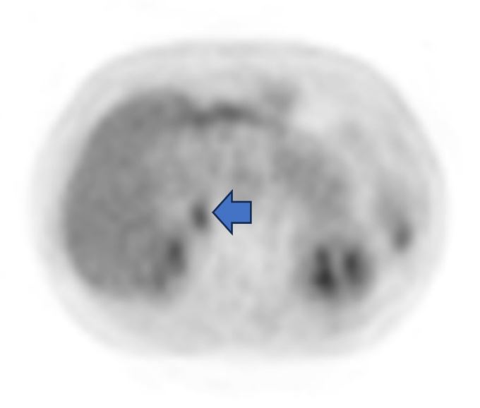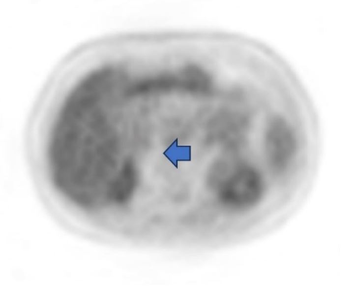 PET imaging after ACST showed residual, albeit significantly reduced, pathological tissue solely localized to the right adrenal gland and in January 2019 the patient received 30 Gy involved field radiotherapy. Nevertheless, the adrenal gland involvement was still visible at control PET evaluation in March 2019.