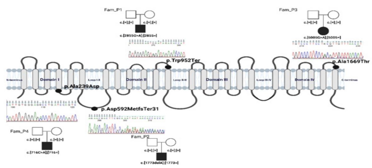 | P4 | c.716C>A | p.Ala239Asp | de novo | Missense | Ex09/ DIS4-S5 |