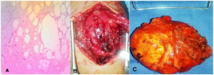 Patient and observation Child aged 11, male, was taken for consultation for a swelling of the left thigh which had been progressively evolving for 7 months. He had no signs of fever or lameness, his general condition was preserved. Clinical examination found a mass measuring 10 cm in long axis on the anterior surface of the proximal 1/3 of the left thigh. It was firm in consistency, painless, without associated inflammatory signs, mobile in relation to the superficial plane and fixed in relation to the deep plane. Elsewhere the somatic examination was normal. The biological assessment was normal. The frontal X-ray of the thigh (Figure 1) showed infiltration of the soft tissues without bone lesions. Ultrasound study of the mass revealed the presence of a well-defined, heterogeneous hyper-echoic formation, crossed by thick and hypervascularized septa on color Doppler. Magnetic Resonance Imaging (MRI) revealed a sub-aponeurotic intermuscular tumor process with a heterogeneous signal with a fatty component in hyper-signal T1 (Figure 2A and B) and T2 (Figure 2C) fading after saturation of the fat. And a tissue component with T1 hypo-signal, intermediate T2 hyper-signal enhancing after Gadolinium injection, without cortical lysis or associated bone signal anomaly. The preoperative biopsy of the mass came back in favor of a lipoblastoma without signs of malignancy (Figure 3A). The indication for tumor excision surgery was retained. The approach was a longitudinal incision extending the old biopsy incision on the anterior surface of the thigh. Surgical exploration found an encapsulated mass very adherent to the different musculoaponeurotic planes which it repressed without invading them (Figure 3B). It was also adherent to the femoral periosteum. The mass was completely resected without capsular opening, following the cleavage planes between it and the muscular planes and removing part of the periosteum. It measured 12 cm in long axis containing several lobules with fatty appearances grouped in clusters (Figure 3C). Histological analysis of the excision specimen confirmed the results of the biopsy by showing an adipose tumor proliferation, made up of regular, large adipocytes whose nuclei are barely visible, suggesting a lipoblastoma without signs of malignancy.