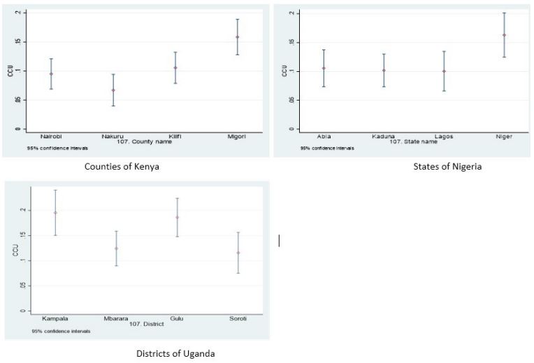 The overall prevalence of CCU in Kenya was 11% (95% CI: 10-13), Nigeria was 12% (95% CI: 10-14) and Uganda 16% (95% CI: 14-18). Table 2 below summarizes the CCU prevalence of the three countries by selected background characteristics.