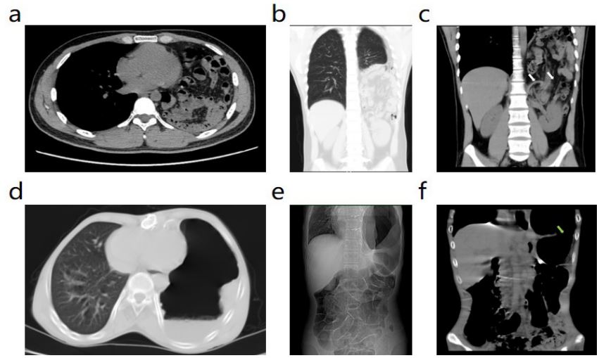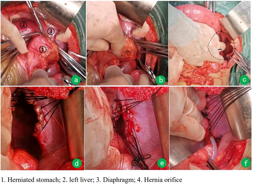 The procedure was as follows: (1) an oblique incision under the left costal margin was made, starting from the xiphoid process and ending at the anterior axillary line; (2) Layer by layer into the abdomen the abdominal organs herniated into the thoracic cavity from the left diaphragmatic defect were found by exploration (Figure 1a). (3) The adhesion between the diaphragm and the abdominal viscera was bluntly separated until the hiatus of the hernia was exposed, and the herniated viscera were returned to the abdominal cavity through the hiatus (Figure 1b); (4) After the contents of the hernia were returned, a huge round hole (diameter ≥5 cm) was found in the left diaphragmatic muscle in the lumbocostal triangle, and the hernia sac protruded into the thoracic cavity (Figure 1c) (5) Hernia ring orthopedic suture: Due to the large diameter and circular shape of the hiatus, it was impossible to suture directly, so the diaphragm was cut open for about 5 cm at the 11 o ‘clock position of the hiatus, making the circular hiatus of the diaphragm into an oval shape (Figure 1d). From the left side to the right side, the diaphragmatic hiatus was sutured intermittently with 10-gauge thick silk suture (spacing 1cm, edge distance 1 cm) (Figure 1e). (6) The lung was reexpanded by continuous negative pressure suction of the hernia sac: a 20F negative pressure drainage tube was placed into the hernia sac in the thoracic cavity through the interrupted suture gap of the diaphragmatic hiatus (Figure 1f), which was extracted and fixed from the left lower abdominal wall. The left lung compressed by the hernia contents was gradually reexpanded by continuous negative pressure suction ball. After complete hemostasis and checking the instrument gauze, the abdomen was closed layer by layer.