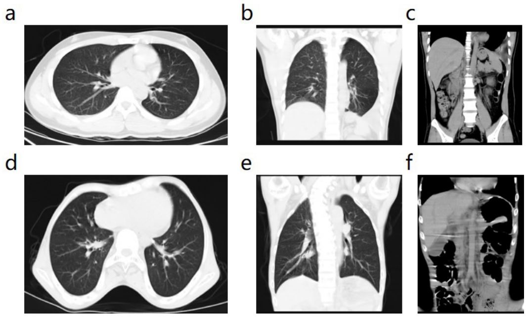 Postoperative follow-up: The patients were followed up for 6-12 months, with an average of 8.5 months. During the follow-up period, no recurrence of diaphragmatic hernia was found by chest and abdominal CT (Figure 3), and no chronic postoperative pain, intestinal adhesion, or pulmonary atelectasis occurred.