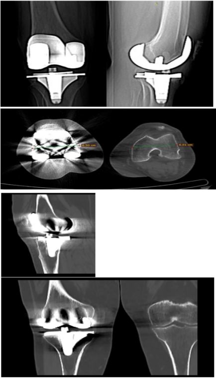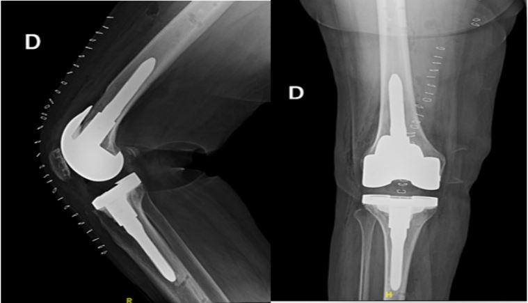 In September 2023, the patient presented to our institution with stiffness and severe knee pain, significantly limiting her daily activities. She reported a Visual Analogue Score (VAS) pain rating of 8/10 and was taking anti-inflammatory medication. Her knee Range of Motion (ROM) was restricted to 35°-85° due to mechanical blockage, indicating potential issues with the implant. To rule out a prosthetic joint infection, we conducted laboratory tests based on the 2018 MSIS criteria, including erythrocyte sedimentation rate, C-reactive protein, procalcitonin, blood count with formula and joint aspiration, all of which yielded negative results [4].