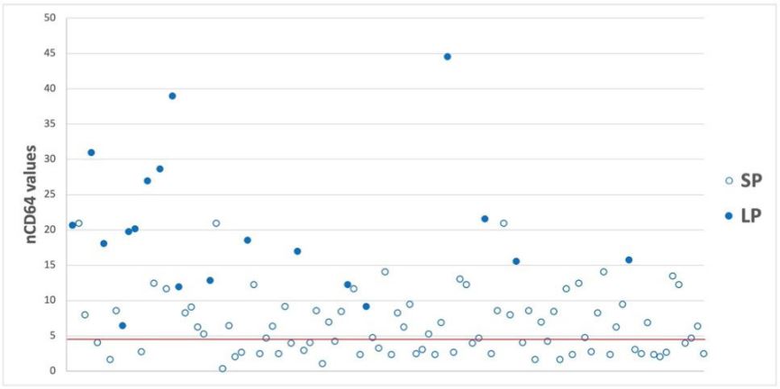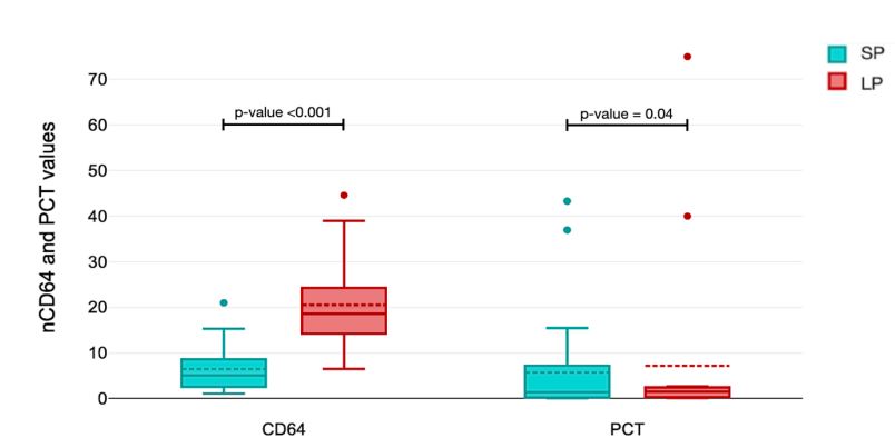 One factor contributing to the differences in nCD64 values could be the range of delays in presenting to the emergency department after the onset of symptoms: it has been demonstrated that the up-and down-regulation of nCD64 after the infectious insult displays time-dependent kinetics [14]. In this scenario, although precise data on the diagnostic delay from the onset of symptoms are not available, it is important to emphasize that all these patients had to be treated in the emergency department due to their acute clinical condition. This indeed restricts the presence of confounding factors between the LP and SP groups.