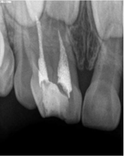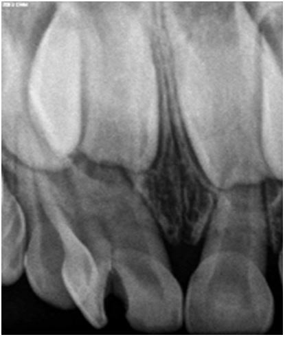 A 5-year-old male patient reported to our clinic with the chief complaint of decayed upper front teeth region. Patient presented with an episode of spontaneous pain which was relieved on medication. Medical history was non-contributory. Clinical examination revealed a geminated deciduous maxillary right central incisor (51, ISO system) having a large crown, showing a groove between non separated crowns on labial surface (Figure 1). It was noted to be non-vital on examination with electric pulp tester (Pulp tester C-pulse, Foshan CICADA Technology, China, input DC 9 V, output 80 V, 90 mA). Radiographic examination revealed two independent pulp chambers and two fused roots but with individual canals within (Figure 2). History, clinical and radiological findings pointed at the diagnosis of chronic irreversible pulpitis and pulpectomy was planned. Local anaesthesia (2% Lidocaine) was administered and rubber dam application was done. Access was achieved from the palatal surface and two canals were located; one, mesial and the other distal. Pulp extirpation and debridement was done by ProTaper Gold rotary files (Dentsply Maillefer, Ballaigues, Switzerland) upto F1. Irrigation of root canal was done with 2.5% sodium hypochlorite and saline. Obturation was done with Metapex (Meta Biomed Co. Ltd, Cheongju, Korea) (Figure 3). Access cavity was restored with glass ionomer cement till the cervical third and final restoration completed with composite.