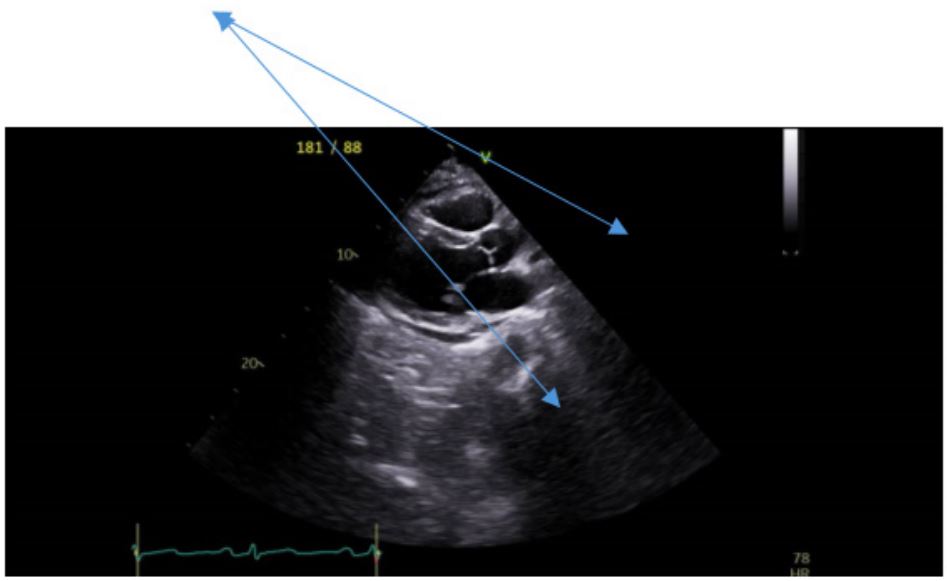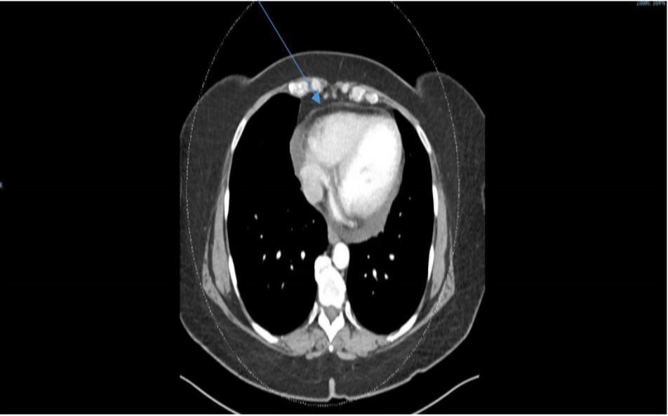 An ultrasound of the abdomen was performed in view of the elevation of the serum transaminases. The liver appeared normal but there was a suspicion of a pancreatic cyst. An abdominal CT scan did not show a pancreatic cyst but did detect a pericardial effusion. She therefore was referred for a transthoracic echocardiogram that revealed new-onset heart failure with hypokinesia in the inferior and septal walls and an ejection fraction of 45%, in addition to a moderate pericardial effusion. Coronary angiography revealed normal coronary arteries. The patient was discharged home on standard therapy consisting of bisoprolol, aspirin, atorvastatin and dapaglifozin.