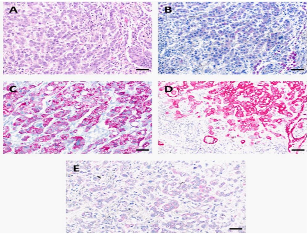 Postoperative pathological examination confirmed advanced tumour stage (pT4, pN1) with lymphand hemangioinvasion. All resection margins were tumour-free. In histological analysis, tumour cells were arranged in nests and stripes, closely resembling hepatoid growth pattern (Figure 2A). The tumour cells showed anisonucleosis, enlarged nuclei and hyperchromasia (Figure 2A). Immunohistochemically, CK7- positive tumour cells were TTF1-negativ in nuclei but showed weak cytoplasmic staining of TTF1 (Figure 2B). 50-60% of the tumour cells were positive for Ki67. Interestingly, tumour cells were positive for Hepatocyte and they showed a weak positive staining for AFP (Figure 2E). NapsinA was negative. Less than 1% of tumour cells were positive for PDL-1. Molecular analysis showed no mutations in genes for BRAF, EGFR, KRAS, ALK, ROS1, RET and NTRK (Figure 2).