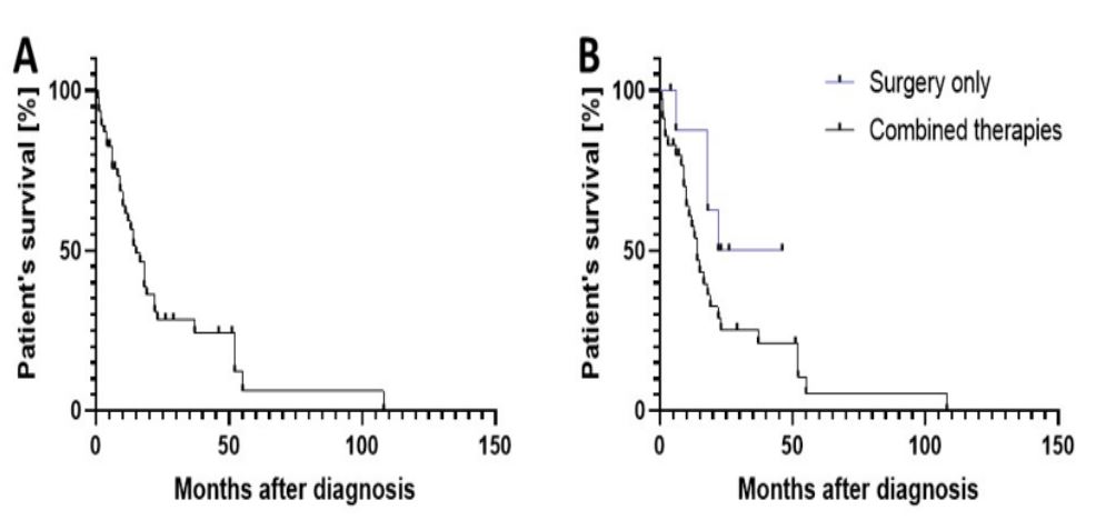 As Figure 3A shows, survival after diagnosis rapidly decreases with a median survival of only 15 months after diagnosis. After 24 months, only about 30% of all patients are still alive. Figure 3B shows the difference in the patient’s survival after exclusively surgical therapy (N=9) or a combined therapy of different therapeutic modalities including surgery or interventional, radiotherapy, chemotherapy, immunotherapy as well as targeted therapies (N=35) and therefore represents a rather heterogenous group. There is no significant difference between both groups (P value>0.05), however the median survival in the “surgery only” collective is 34 months whereas in the “combined therapies” collective the median survival is only 14 months after diagnosis.