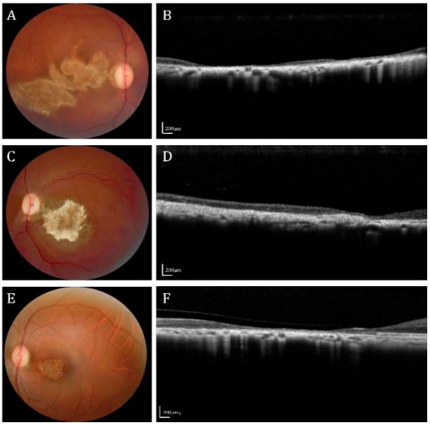 Cases 2-4: Case 2, 3 and 4 were separately from three 18-year-old monkeys (Figure 2A-F). The irregular atrophy patches could be seen mainly in the inferotemporal region of the retina, with relatively clear boundaries and irregular pigmentation deposition. Optical Coherence Tomography (OCT) showed attenuation and atrophy of both inner and outer retinal layers as well as the choroid. Since the medical history of the animals were hard to trace back, we speculated possible pathogenesis of chronic inflammation for case 2, 4 and trauma or Age-Related Macular Degeneration (AMD) for case 3.