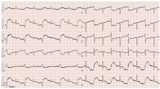 A 71-year-old woman presented with a two-month history of anorexia. Her medical history was notable for Mucosa-Associated Lymphoid Tissue lymphoma (MALToma) of the stomach and hemodialysis. Laboratory tests revealed electrolyte imbalances such as low levels of potassium, calcium, phosphorus, and magnesium. Gradual improvement was attempted to avoid refeeding syndrome, but ventricular fibrillation developed during routine hemodialysis and was immediately treated with electronic defibrillation. Later, a diagnosis of takotsubo cardiomyopathy and central pontine myelination was added. Follow-up electrocardiography showed a QTc interval of 633 ms and electrical alternans of the QRS complexes and T waves (Figure 1). Electrical alternans is a rare phenomenon and special attention should be paid when electrical alternans includes T-wave alternans, a finding indicative of severe electrical instability [1,2]. In our case, careful control of electrolytes and continuous administration of intravenous lidocaine prevented the recurrence of fatal arrhythmias, although nonsustained ventricular tachycardia was often seen on the monitor.