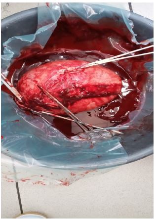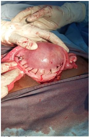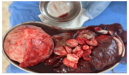 A patient underwent an elective caesarean section. Before the surgery, the anaesthetist reviewed the patient’s condition all parameters were stable for surgery. During the surgery through Pfannenstiel incision (case 2 Figures 4,5), a huge intramural myoma measuring about 10 cm by 12 cm was noted on the posterior uterine wall and other multiple intramural myomas over the posterior and anterior uterine walls including the lower segment of the uterus. A lower segment uterine incision was made a live baby girl 3.4 kg with an APGAR score of 8-10 was delivered. To execute a myomectomy, a longitudinal incision on the posterior uterine wall was made to remove the huge myoma and several incisions on the posterior and anterior walls of the uterus to remove other small myomas were made. The hemostasis was achieved by the repair of myoma and caesarean incision. The uterine compression sutures (Hayman sutures), intravenous tranexamic acid 1 g, per rectal misoprostol 800mcg and intravenous oxytocin 20IU in 500 mls of ringers’ lactate to run for 4 hrs were provided to Prevent Postpartum Hemorrhage (PPH). The estimated blood loss was 800 ml; however, no blood transfusion was required. The operation lasted for 60 minutes.