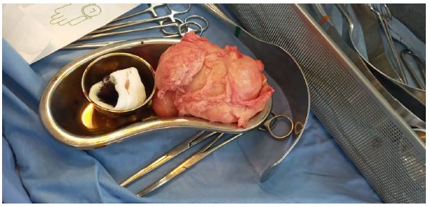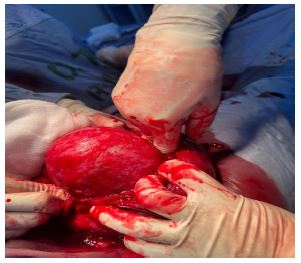 Due to the myoma’s position, which offered a risk of impeding delivery, the patient underwent emergency caesarean surgery on 5th October 2021. Before the surgery, the anaesthetist reviewed the patient’s condition. Her haemoglobin level was 13.3 g/dl, and she belonged to blood group B Rhesus. During the surgery (Case 1 Figures 1-3), a single intramural myoma measuring about 18 cm by 16 cm and weighing 600 gm was excised. To execute a myomectomy, the incision was expanded laterally. The estimated blood loss was 900 ml; however, no blood transfusion was required. The operation lasted for 47 minutes. The procedure went well, and a healthy baby boy weighing 2200 gm with an APGAR score of 9 after one minute and 10 after five minutes was born without complications. To prevent severe bleeding, the patient’s uterine closure was done in layers and was given 10 IU of oxytocin intramuscularly, followed by 20 IU of oxytocin in 500 ml of Hartmann solution for 4 hours following birth, and 800 micrograms of Misoprostol were given rectally.