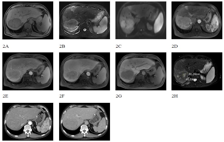 3. Medical Treatment: The recommended treatment regimen for actinomycosis involves a high dose and complete course of penicillin [4]. In this case, the initial anti-infective therapy included doxycycline and amphotericin B administered at the appropriate total dose and duration. Subsequently, the antibiotic regimen was modified, and the patient was administered fluconazole for over one week. Upon review of the liver MRI, the lesion size was reduced compared to the image taken one week earlier (Figure 2H), and the edema of the peripheral liver parenchyma was also diminished, accompanied by new necrosis in the center of the lesion. This observation indicates that the antibiotic treatment was effective and supports the pathological diagnosis.
