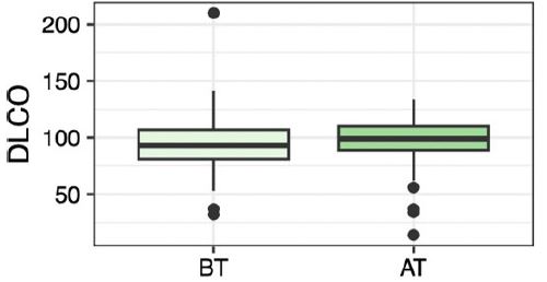 | DLCO, median(IQR) | 93(81, 107) | 94(84, 108) | 92(81, 105) | 0.549 |