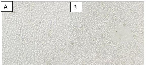 The isolation of the measles virus in culture was performed using the Vero/dogSLAM cell line, which is permissive, safe, and easy to use for the growth of the measles virus. This cell line was developed by transfecting the Vero cell line with a plasmid encoding the gene for the canine Signaling Lymphocyte Activation molecule (dogSLAM). The DogSLAM receptor has been identified as the cellular receptor for the measles virus. The treated sample was inoculated with gentamicin on a pre-established Vero/dogSLAM cell monolayer at 85-95% confluence. After incubation at 37°C, daily microscopic observation of the cells allowed for the detection of morphological changes in the Vero/dogSLAM cells, or the Cytopathic Effect (CPE), produced by the replication of the measles virus in cell culture. The typical CPE consists of the formation of syncytia, which appear as large multinucleated cells caused by the fusion of infected cells (Figure 2).