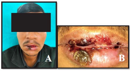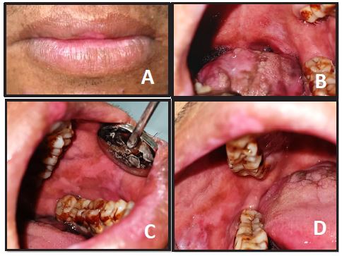 On extra-oral examination, a brownish-black crested, irregular lesion was seen over the upper and lower lip region measuring 1 x 0.5 cm (in upper lip) and 0.5 x 0.5 cm (in lower lip) at the middle 3rd aspect (Figure 1).