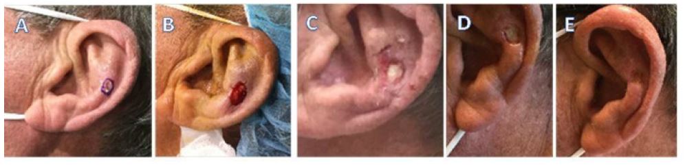 Case 1 (Figure 1) is a 65 y/o male with psoriasis who underwent Mohs surgery for squamous cell carcinoma, in situ, of the antihelix of the left ear. Images shown are A) pre-operative, B) defect following Mohs surgery, C) following eHAM application at day 10, D) at day 18 and E) final image at day 25. The final eHAM application was on day 18 (week 3). The initial defect area was 1.1 cm2 that decreased to 0.2 cm2 at day 25 (week 4) following three applications of eHAM.