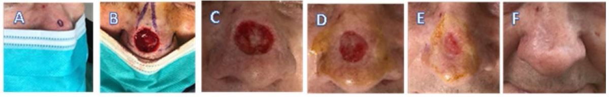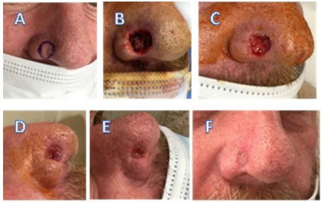 Case 2 (Figure 2) is a 76 y/o male with hypertension and hypertriglyceridemia who underwent Mohs surgery for moderately differentiated squamous cell carcinoma of the nasal dorsum. Images demonstrate A) pre-operative, B) defect following Mohs surgery, C) following eHAM application at day 9, D) at day 21, E) at day 58 and F) final image at day 79 (week 11). The final eHAM application was on day 58 (week 8). The initial defect area was 3.6 cm2 which decreased to 0.4 cm2 at day 58 (week 8) following seven applications of eHAM. The final image at day 79 (week 11) is shown in (Figure 2F).