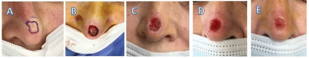 Case 3 (Figure 3) is a 69 y/o female with no comorbidities who underwent Mohs surgery for a nodular and infiltrative basal cell carcinoma involving the nasal supratip. Images include A) pre-operative, B) defect following Mohs surgery, C) following eHAM application at day 7, D) at day 14, E) and at day 21. The final eHAM application was on day 21 (week 3). No eHAM was applied on day 28 (week 4). The initial defect area was 2.1 cm2 which decreased to 0.12 cm2 at day 35 (week 5) requiring five applications of eHAM. The final image was taken at day 45 (week 5) shown in (Figure 3E).