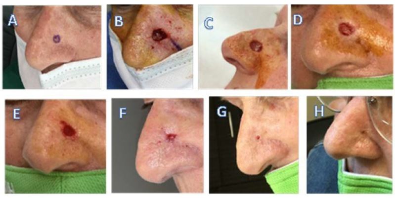 Case 4 (Figure 4) is a 75 y/o female with arthritis, hypertension, and hypertriglyceridemia who underwent Mohs surgery for a nodular basal cell carcinoma of the left nasal sidewall. Images include A) pre-operative, B) defect following Mohs surgery, C) following eHAM application at day 9, D) at day 17, E) at day 24, F) at day 29 G) at day 39 and H) final image at day 46. The final eHAM application was on day 29 (week 4). The patient did not receive an eHAM application on day 39 (week 5). The initial defect area was 1.4 cm2 that decreased to 0.01 cm2 at day 46 (week 7) following five applications of eHAM.