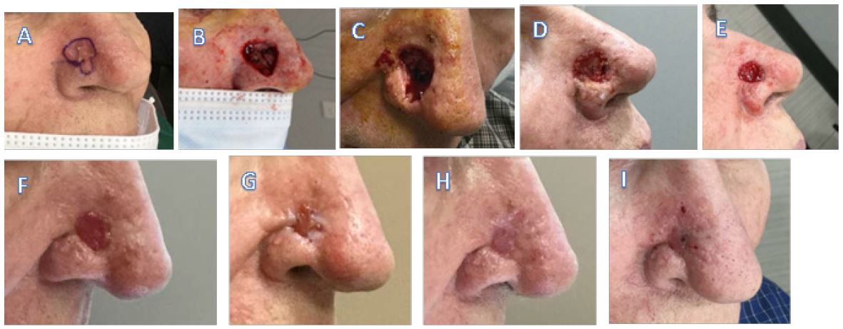 Case 6 (Figure 6) is a 71 y/o male with no comorbidities who underwent Mohs surgery for a micro-invasive, squamous cell carcinoma of the right nasal sidewall. Include: A) pre-operative, B) defect following Mohs surgery, C) following eHAM application at day 8, D) at day 17, E) at day 33 F) at day 40, G) at day 47, H) at day 54, and I) final image at day 60. The final eHAM application was on day 54 (week 8). The initial defect area was 6.2 cm2 that decreased to 0.8 cm2 at day 54 (week 8) following seven applications of eHAM. Complete healing was observed at day 60 (week 9) as shown in (Figure 6I).