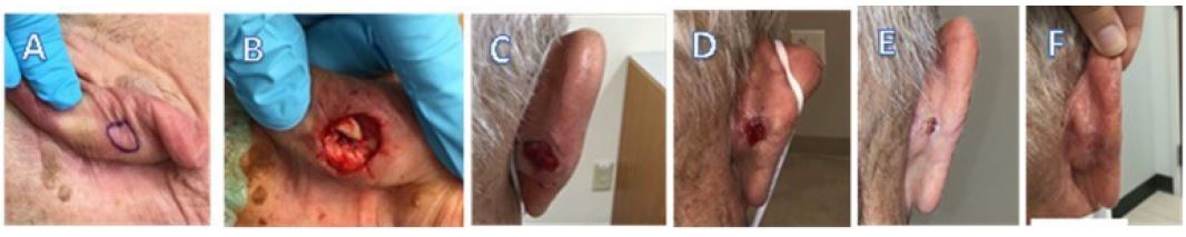 Case 8 (Figure 8) is a 77 y/o male with no comorbidities who underwent Mohs surgery for a nodular basal cell carcinoma of the right posterior auricle. Images include A) pre-operative, B) defect following Mohs surgery, C) day 9, D) day 30, E) day 37, and F) and final image at day 52. The final eHAM application was on day 37 (week 5). The initial defect area was 3.2 cm2 that decreased to 0.4 cm2 at day 52 (week 7) following six applications of eHAM.