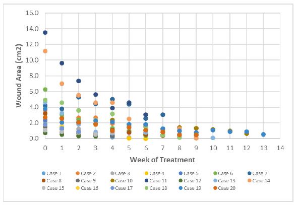 Figure 9 is a compiled graph comparing wound area closure to number of weeks of treatment for the 20 Mohs surgical defects in the case study. The average initial wound defect area with exposed cartilage was 3.73±3.30 cm2 and ranged from 0.70 to 13.50 cm2. The average final defect area was 0.57±0.67 cm2 and ranged from 0.01 to 3.10 cm2 (Table 2). The average area defect closure was 77±23% during eHAM treatment that required an average of 7±3 weeks for defect closure. During treatment, the number of eHAM applications ranged from 2-14 applications for these 20 patients that were treated on the study. None of the 20 defects in the study required skin grafts for wound closure.