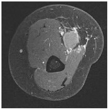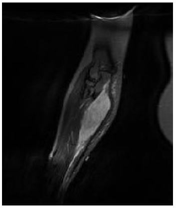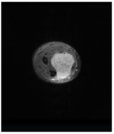 The patient re-presented in early May 2023 with a palpable mass in the distal right arm, located proximal to the field of the previous sarcoma excision. This raised concern for recurrence or a new malignancy, and an MRI of the right upper limb was performed to further investigate. The MRI included T1-weighted, T2-weighted, and fat-suppressed contrast-enhanced sequences of the distal arm. The scans revealed a mass in the anteromedial aspect of the distal arm, suspicious for malignancy, as can be seen in Figure 7. The lesion appeared heterogeneously hyperintense on T2- weighted images and demonstrated irregular contrast enhancement, consistent with a possible sarcomatous recurrence. No direct invasion into the surrounding bone or neurovascular structures was noted. Further evaluation, including biopsy, was recommended to confirm the nature of the mass.