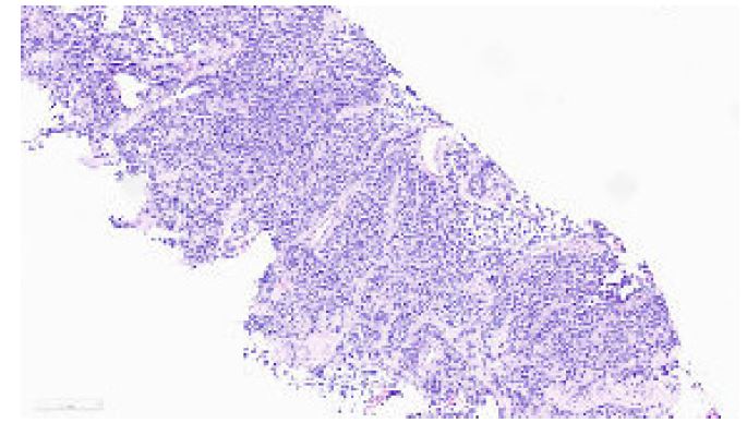 In September 2022, a CT scan of the thorax, abdomen, and pelvis was performed for re-staging. While no pulmonary disease was detected, the scan revealed four suspicious breast nodules (two on each side), as shown in Figure 4. A biopsy later confirmed these nodules to be metastatic sarcoma, identical to the forearm mass, with pathology slides presented in Figures 5 and 6. Prior to the mastectomy, the patient received six rounds of VIT chemotherapy, which included vincristine, irinotecan, and temozolomide. Subsequently, a bilateral mastectomy with partial excision of the pectoralis major muscle was performed in March 2023. The procedure was successful, and no complications were reported. The patient was subsequently referred to physiotherapy.