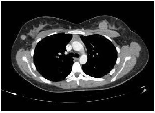 Metastatic breast malignancies are very uncommon, with rates of 0.5% to 3%. Metastasis to the breast has been demonstrated from primary tumours such as mesotheliomas, malignant melanomas, appendiceal carcinoid, epidermoid cervical carcinoma, and rhabdomyosarcoma [1,2]. Identifying the histological type is necessary for optimal management and prescribing the appropriate systemic therapy. In our case, sarcoma metastases were detected in both breasts during follow-up, and upon receiving a good response to chemotherapy, bilateral mastectomy was performed.
