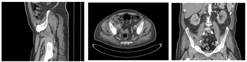 Symptomatic relief was provided with Perfalgan (1 g IV, four times daily) and pethidine (50 mg intramuscularly, three times), addressing the patient’s pain. Additionally, Prizma 4.5 IV was given four times daily, while Clexan (40 mg subcutaneously) and Lasix (20 mg were administered as part of the management strategy to prevent thromboembolic complications and manage fluid status. After identifying significant fluid collections via imaging, US was performed for drainage, followed by a pelvic MRI with contrast (Figure 3) for further investigations, which shows: