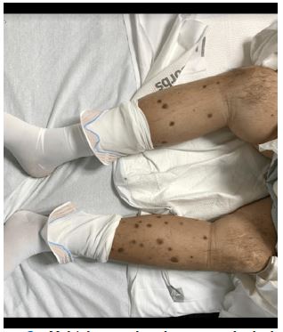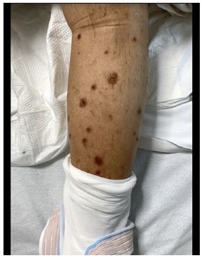 We present a 61 year old male with a past medical history of type 2 diabetes, congestive heart failure, COPD and recurrent admissions for exacerbation of heart failure who presented with multiple raised plaques on his lower extremities with significant pruritus (Figure 2). Social history included occasional smoking and drinking alcohol on weekends. Family history included a history of colon cancer in his mother who is deceased. Other social determinants of health include unstable living situations where he is in the care of his siblings , and noncompliance with medications. The patient reported that the lesions have been present for many years and are associated with stinging, pain, and itching exacerbated by exposure to sunlight. However, there was no mucosal involvement. He was then admitted for further workup and treatment, and Dermatology specialist’s were consulted. Subsequently, a punch biopsy of the keratotic plaques was performed for histopathology characteristics of the lesion. The histological examination revealed cornoid lamellae of parakeratotic cells with an absent granular layer beneath them, and the superficial dermis showed a dense perivascular lymphocytic infiltrate. Based on the clinical and histopathological findings, a definite diagnosis of porokeratosis was reported. Based on the Dermatology specialist’s recommendations, the patient was instructed to follow up outpatient for additional treatment. As his presentation would be of particular interest due to being an uncommon disease, the patient was asked for consent to submit his case for publication, which he approved. Hospital course was uneventful and the patient was discharged with instruction to follow up with outpatient dermatology. However, on attempts to follow up with the patient, it was discovered that he had poor medical compliance and did not follow with outpatient dermatology.