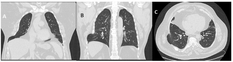Lung hernias result from the protrusion of part of the lung parenchyma through the rib cage. They can occur after trauma or as a post-surgical iatrogenic, but spontaneous occurrences is very rare [1]. The authors present a case of a 57-year-old man, former smoker, overweight, with obstructive sleep apnea. He went to hospital with one-week history of dry cough, with no other associated symptoms, no alterations on physical examination or significant analytical changes. A viral infection was assumed. He came back five days later with chest pain and swelling in the right latero-basal region, worsened by coughing. Objective examination revealed a hematoma at that location. A chest CT scan showed 7th costal arch’s fracture and a right lung herniation in this area (Figure 1).