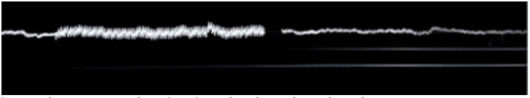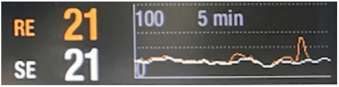 We observed noise detected in the raw EEG alongside the spectral entropy waveforms during the procedure when the testing stimulator was activated (Figures 1 & 2). We noted that the artifact was also present at lower stimulation current levels but disappeared for currents below 2 mA. The Entropy signal’s RE and SE components were affected and altered.