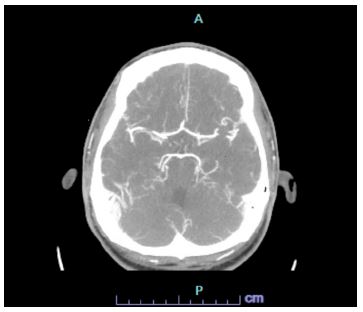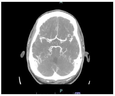 In the ED the patient denied any current symptoms and the physical exam was negative for any acute neurological findings with an NIHSS of 0. The patient’s parents at bedside endorsed dysarthria prior to arriving in the ED. A code stroke was initiated in the ED and a CT Head and CT angiogram were taken, both with unremarkable findings (Figures 1 & 2). Shortly after, the patient experienced another episode of dysarthria lasting for less than five minutes, to which a second code stroke was called and a perfusion CT was taken, showing increased Tmax in the left occipital lobe (Figure 3). Patient was transferred to the ICU for tenecteplase administration and observation with serial neurovascular checks and consults from neurology, cardiology, infectious disease.