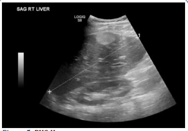 While in the ICU, the patient improved and did not have any further acute neurological events. Initial lab work on presentation showed normal CMP and troponins, and was pertinent for atypical lymphocytes, transaminitis. Daily labs showed a mild thrombocytopenia, improvement in the transaminitis, a normal urinalysis, and a negative urine drug screen. Daily labs on the date of discharge showed a mild thrombocytopenia and transaminitis. Neurology recommended an EEG which showed mild diffuse slowing with asymmetry and an MRI which showed no acute infarct or hemorrhage, midline shift, mass effect or evidence of acute ischemic stroke (Figure 4). Infectious disease recommended empiric vancomycin, ceftriaxone and acyclovir and virology was done confirming a positive EBV infection. Due to the patient’s symptomatic improvement, lumbar puncture was not done. Cardiology recommended 2D-echocardiogram with bubble study to rule out embolic stroke which showed a normal cardiac status. Gastroenterology was consulted due to mild transaminitis likely secondary to infectious mononucleosis and recommended a RUQ ultrasound, showing a 4 cm echogenic lesion in the right lobe (Figure 5). Over the course of the patient’s admission in the ICU, the patient did not endorse any neurological or cardiac complaints, reporting only a mild headache and vomiting with normal serial neurological exams.